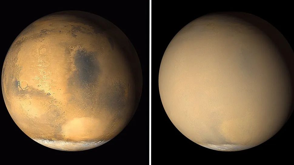 Nghiên cứu mới cho thấy các vệt tối có thể đóng vai trò lớn hơn nhiều trong chu trình bụi của Sao Hỏa so với chúng ta từng nghĩ. Cứ vài năm một lần, Sao Hỏa lại bị bao phủ bởi những cơn bão bụi toàn cầu che kín cả hành tinh, thể hiện trong các ảnh chụp tháng 6/2001 (trái) và tháng 7/2001 (phải). (Nguồn ảnh: NASA/JPL/MSSS).