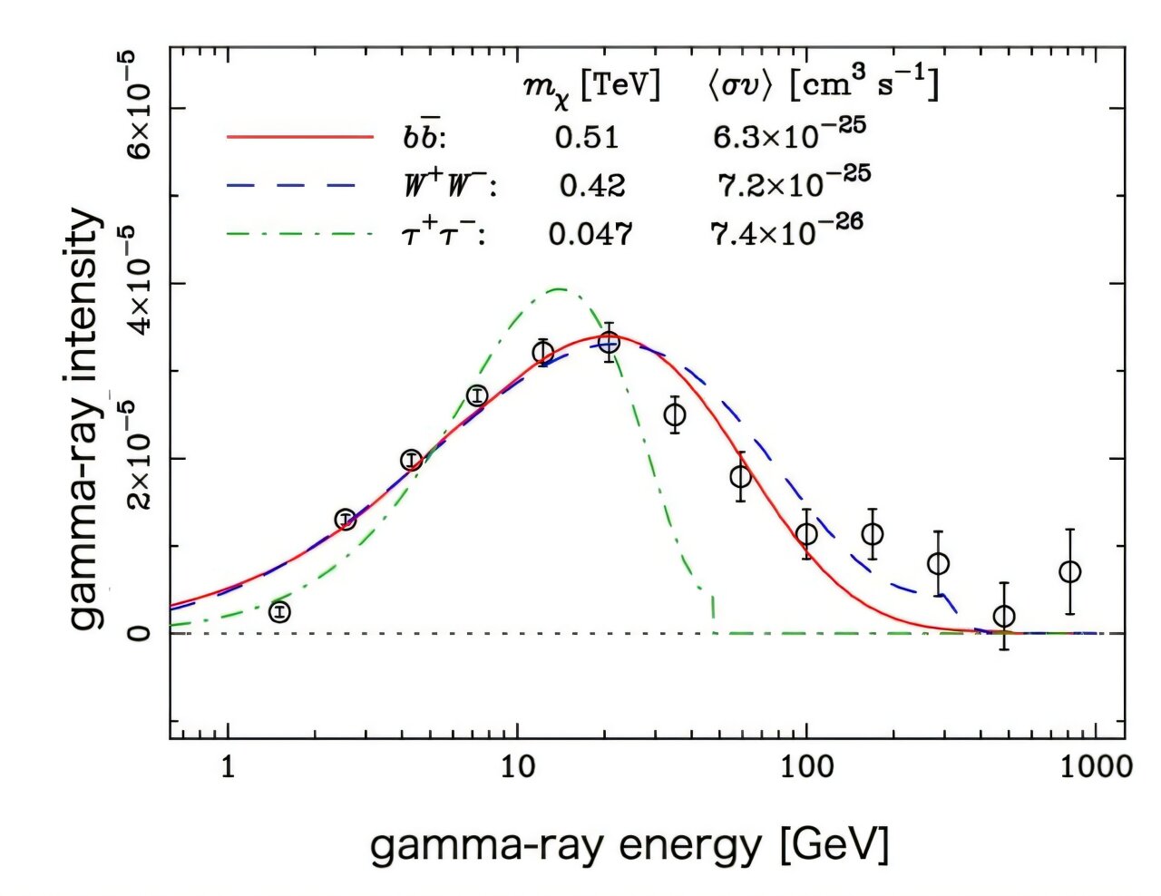 Đồ thị cường độ tia gamma phụ thuộc vào năng lượng photon của bức xạ từ quầng thiên hà (dữ liệu thực nghiệm). Đường màu đỏ và xanh biểu diễn phổ phát xạ gamma dự đoán khi các hạt WIMP hủy lẫn nhau, ban đầu tạo ra một cặp quark loại bottom (b) hoặc một cặp boson W - những hạt cơ bản được biết đến trong Mô hình Chuẩn của vật lý hạt. Nguồn: Tomonori Totani, Đại học Tokyo.