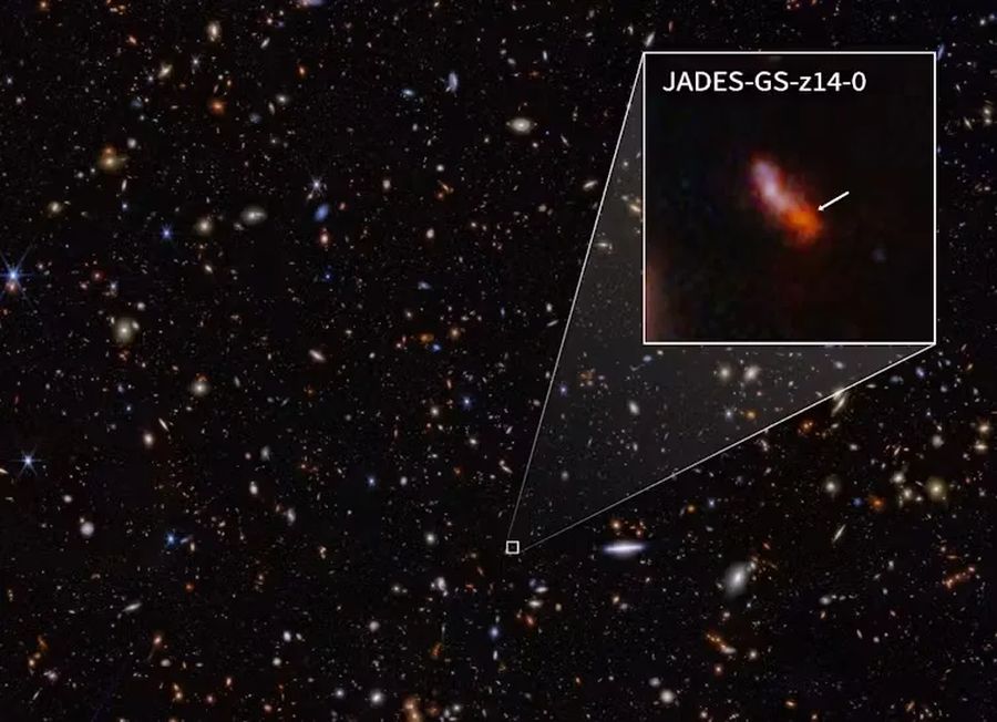 Kỷ lục trước đó về thiên hà sớm nhất được xác nhận, JADES-GS-z14-0, cũng do JWST phát hiện. (Nguồn ảnh: NASA, ESA, CSA, STScI, Brant Robertson (UC Santa Cruz), Ben Johnson (CfA), Sandro Tacchella (Cambridge), Phill Cargile (CfA) và nhóm cộng tác JADES.)