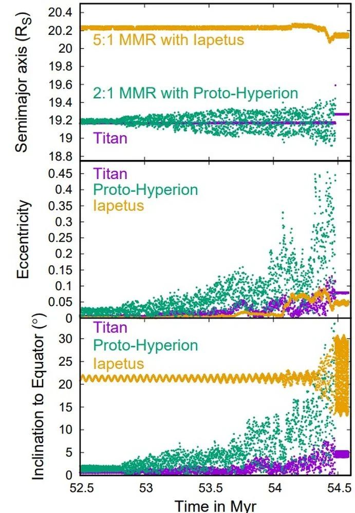 Các bảng từ nghiên cứu minh họa một số kết quả mô phỏng. Chúng cho thấy “một mô phỏng trong đó tiền-Hyperion va chạm với Titan, và quỹ đạo cuối cùng của Iapetus tương tự như hiện nay,” các tác giả giải thích. Bảng trên cùng cho thấy cộng hưởng chuyển động trung bình (MMR) giữa Titan và tiền-Hyperion, và giữa Titan và Iapetus, cùng với bán trục lớn của Titan. “Các bảng ở giữa và phía dưới biểu diễn độ lệch tâm và độ nghiêng so với xích đạo Sao Thổ của ba vệ tinh,” các tác giả viết. Nguồn ảnh: Ćuk et al. 2026. PSJ